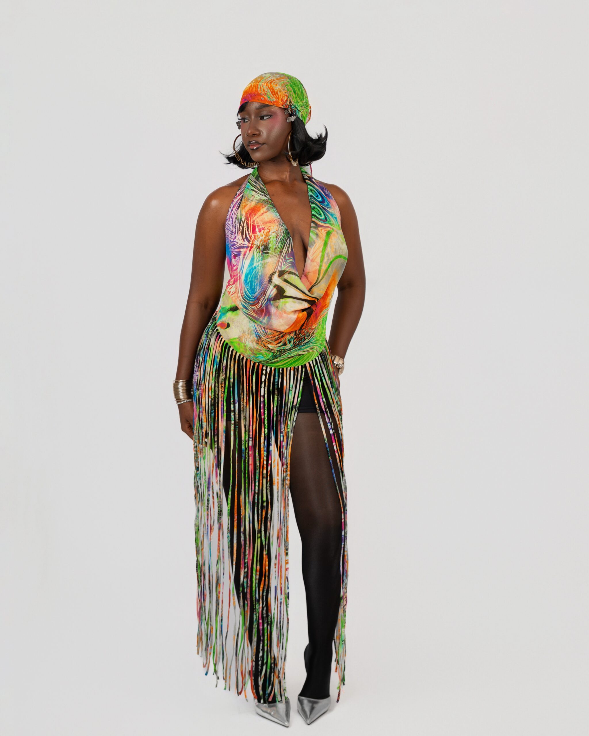 Vibrant and bold, this Top crafted from lightweight fabric in a swirl of vivid rainbow hues features a plunging neckline and flowing fringe detailing that moves beautifully with every step and statement appeal, perfect for festival, holiday or resort looks.