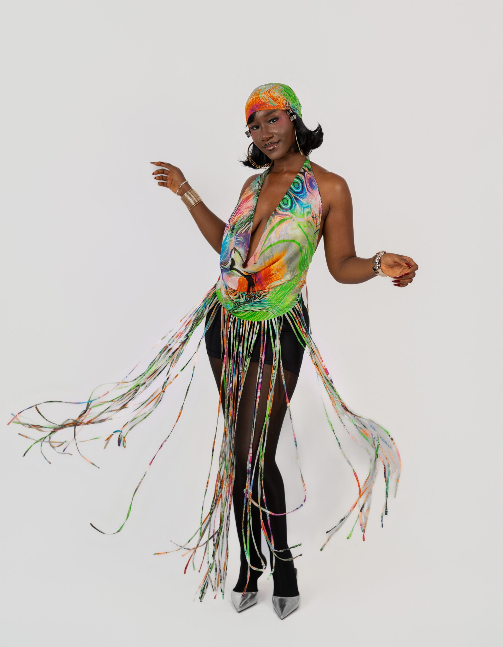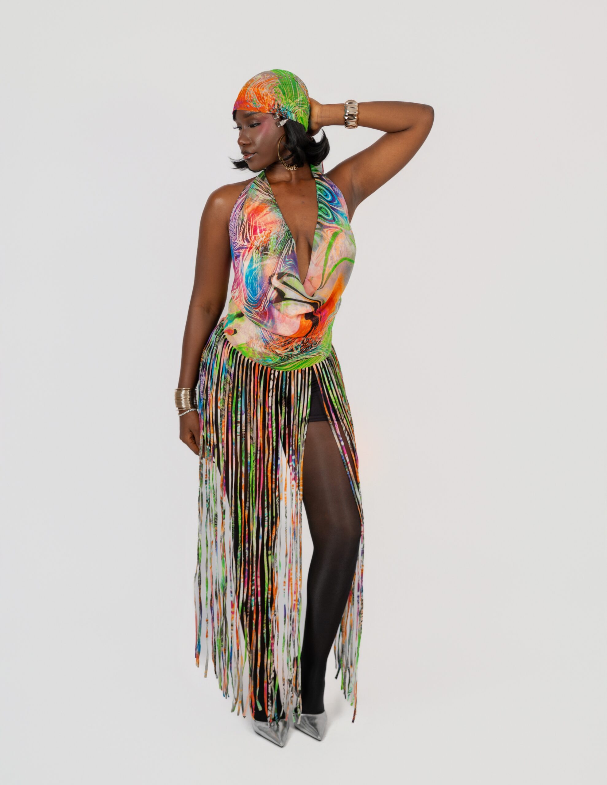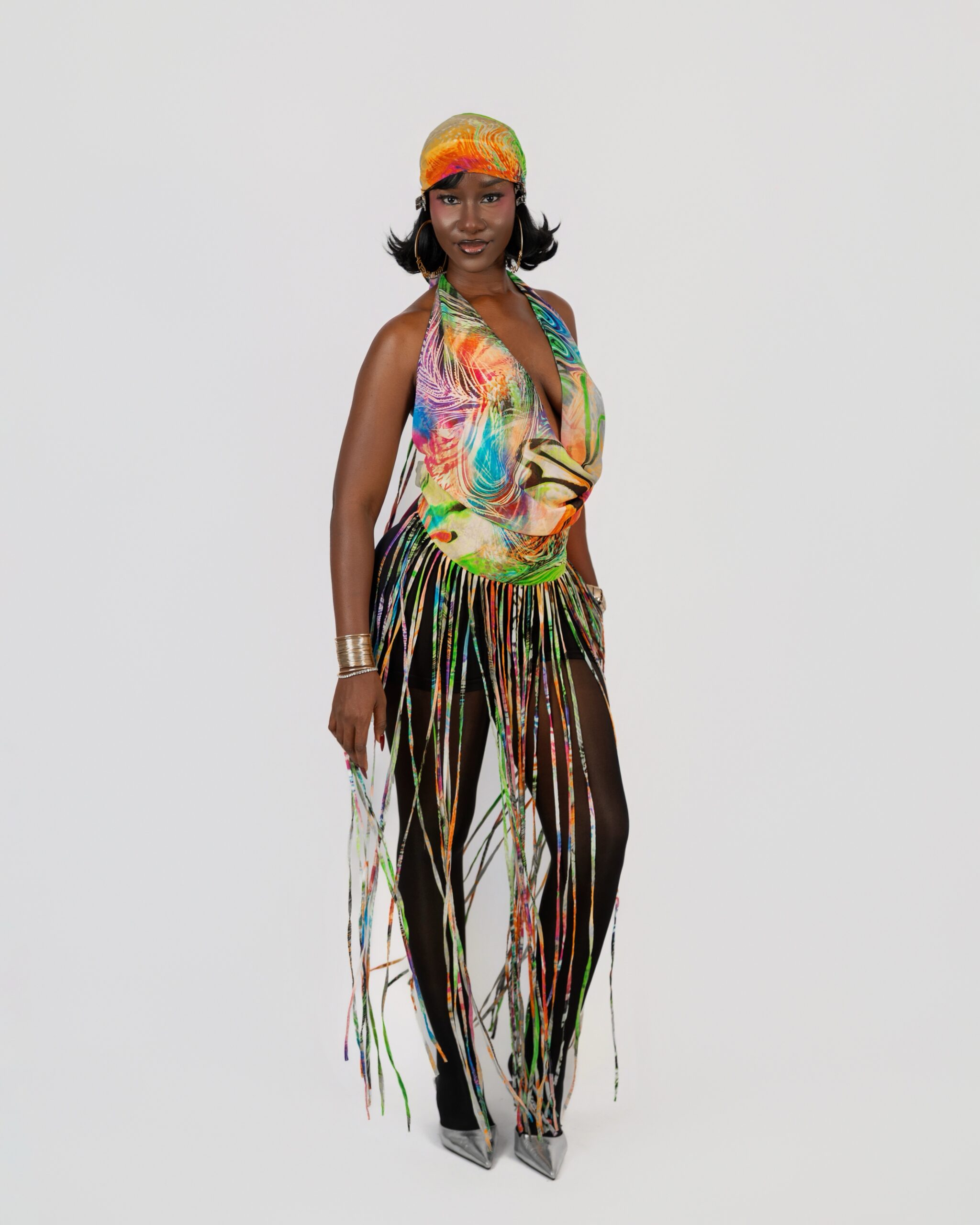 The FIRI mini dress is the ultimate little fun dress. It’s a four-piece outfit featuring a super mini dress with low-cut drape neckline, a detachable neck scarf with matching inner shorts and beaded head scarf. The fitted corseted bodice is perfectly tailored to hug your curves and the hand- placed crystal tonal dropping beads makes it an elevated and charming piece.